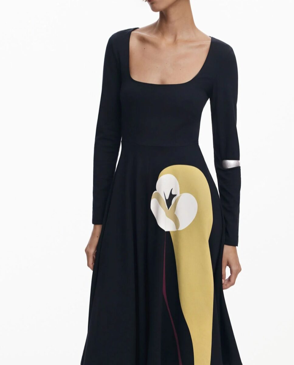 Abito nero tessuto stupendo in maglina consistente elasticizzato. Lungo dipinto laterale dai colori vivi e abbinabili a tanti accessori o