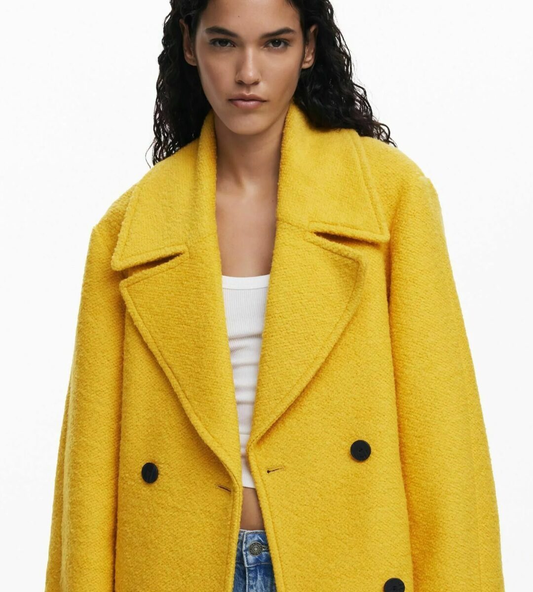 Materiale: Pile Dettagli prodotto Giaccone in lana Giallo con ampio doppio petto che dona una linea molto pulita ed elegantemente sportiva.